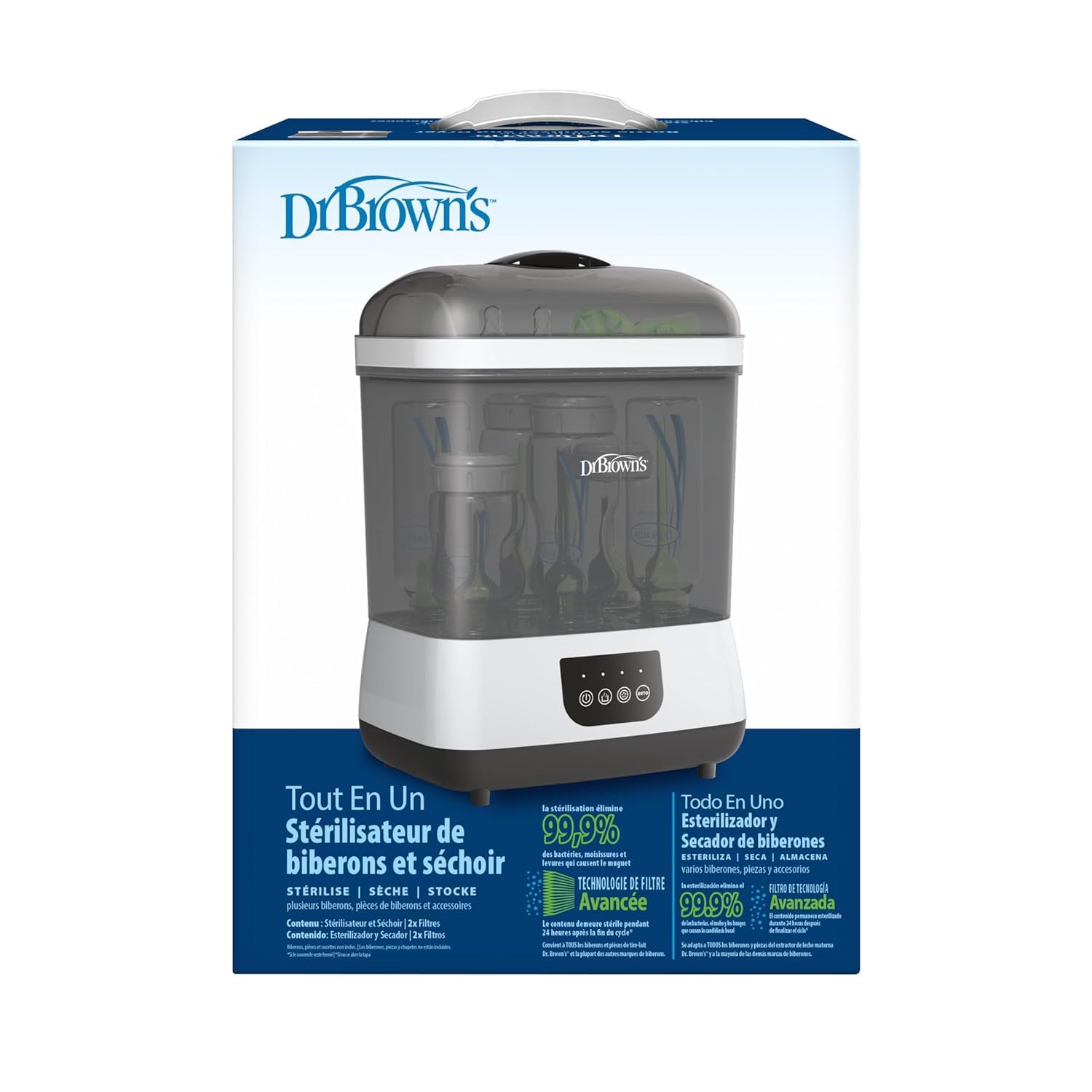 Steam sterilize and dry up to six baby bottles at once, plus bottle parts, breast pump parts, pacifiers, teethers, and more with Dr. Brown’s Bottle Sterilizer and Dryer. Steam heat sterilizes to eliminate 99.9% of bacteria, mold, and the yeast that causes thrush. Contents can stay sterilized for 24 hours after the cycle has ended if the lid is unopened – meaning you can keep your bottles and parts stored inside with no contamination. The two included HEPA filters capture up to 95% of airborne particles, ensuring purified air for bottle drying. Each filter lasts up to 6 months for a full year of filtration. Easy-use operation lets you sterilize only, dry only, or combo sterilize and dry. Comes with a removable accessory tray that fits on top of the bottle basket to sterilize bottle parts and accessories. The removable basket is designed to fit all Dr. Brown’s bottles and most other bottle brands. Measuring cup included. Warranty valid in the US and Canada only.